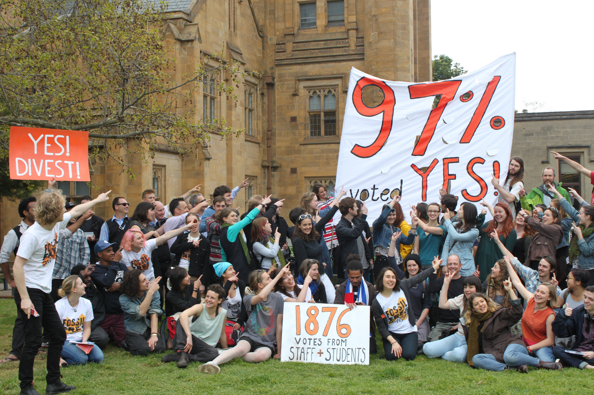 It is Wednesday September 24th, 4 days after two week long referendum campaigns drew to a close at two Australian universities, the University of Melbourne and the University of New South Wales (UNSW). Around 80 people have gathered on the main lawn at the University of Melbourne to hear from local, vocal supporters of divestment and to learn the results of the referendum.