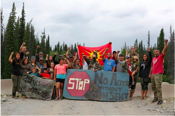A photo of indigenous leaders and supporters at the entrance to the Unist’ot’en Camp. The camp is currently blocking two Keystone XL’s worth of carbon.