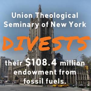 June 10, 2014 Union Theological Seminary of NYC Divests $108m Endowment The fossil fuel divestment spirit is sweeping faith communities around the world. Today, the trustees of the Union Theological Seminary...