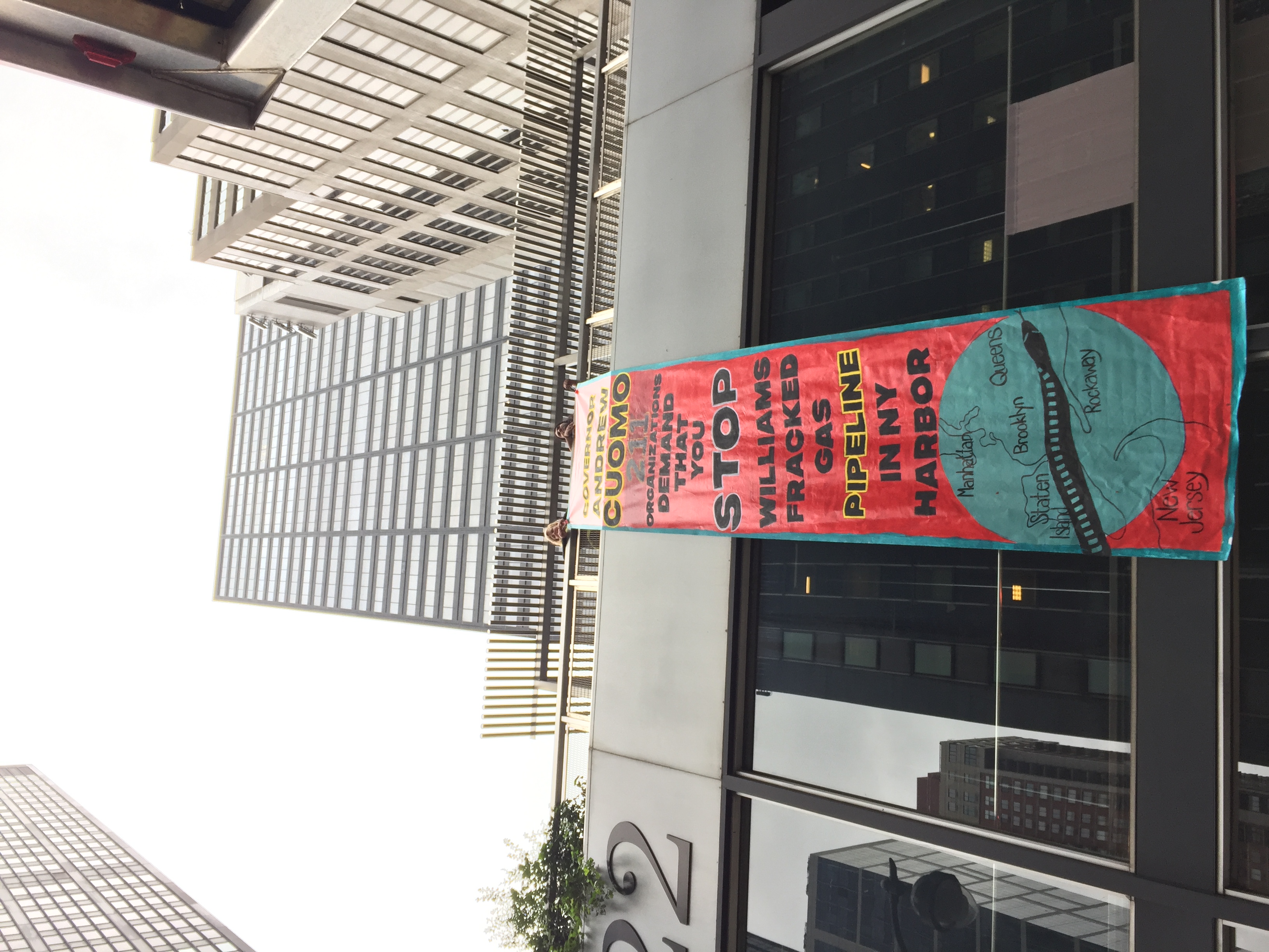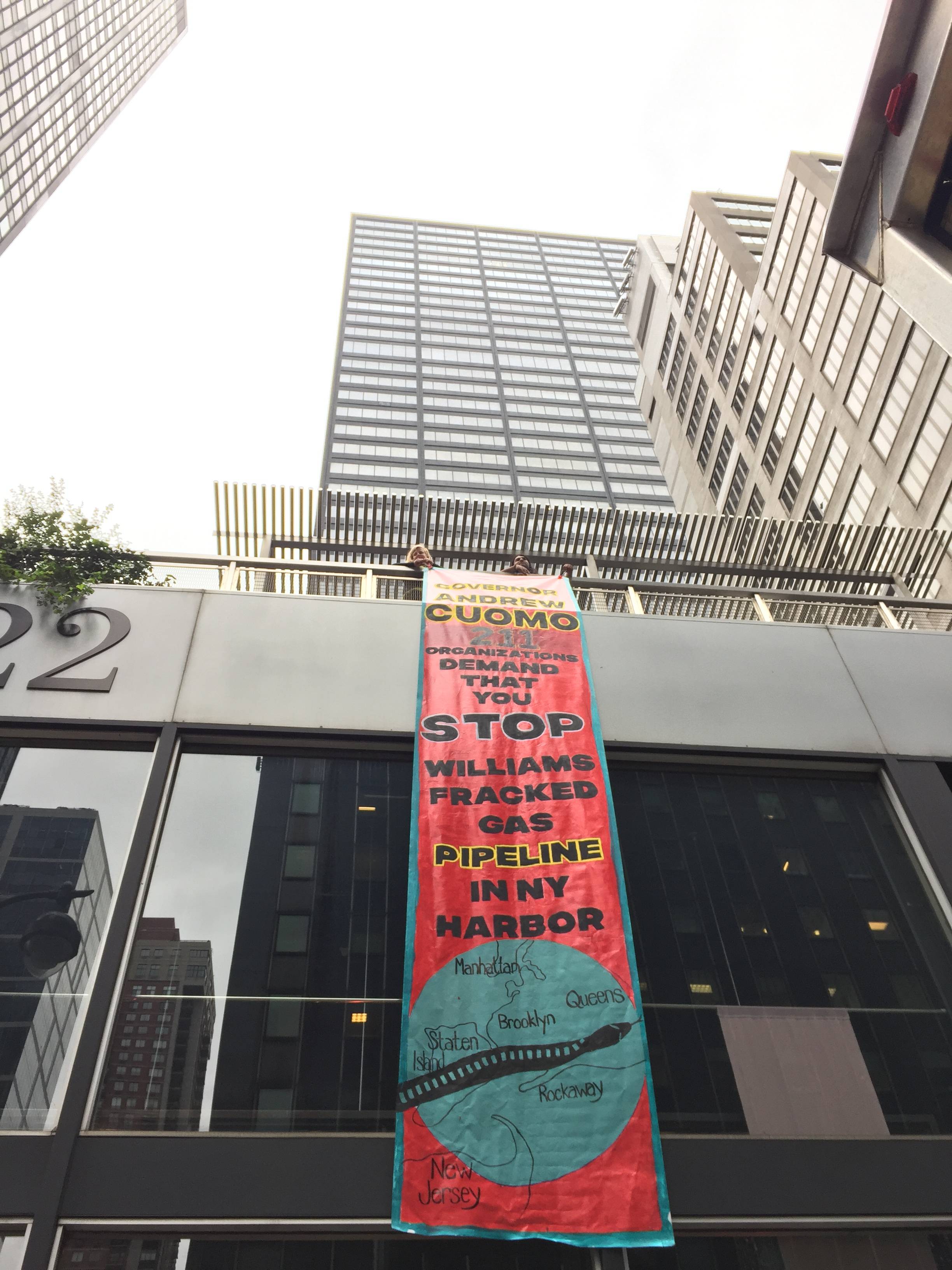 New York, NY — New Yorkers took direct action outside Governor Andrew Cuomo’s New York City office today sending a clear message: be a real climate leader and stop the Williams NESE Pipeline. Dozens of activists rallied before dropping a 25-foot banner across the street, and delivering a letter signed by 210 New York organizations opposing the pipeline.